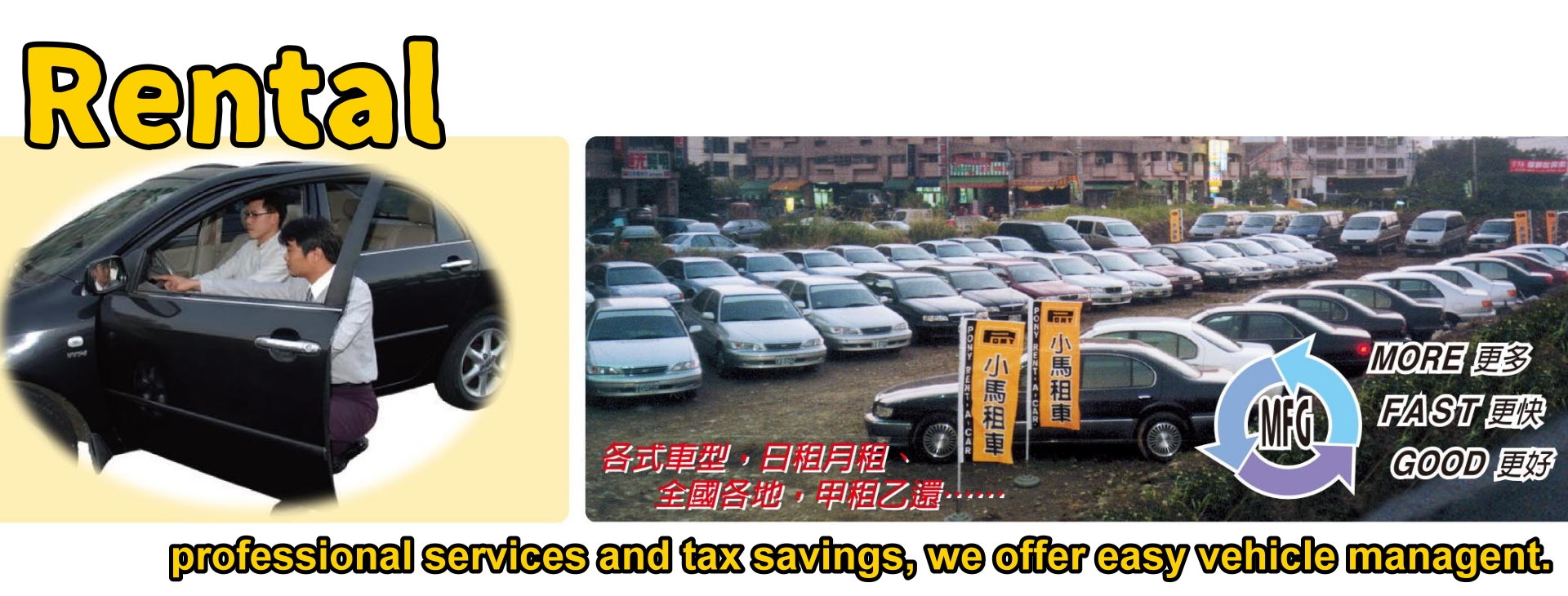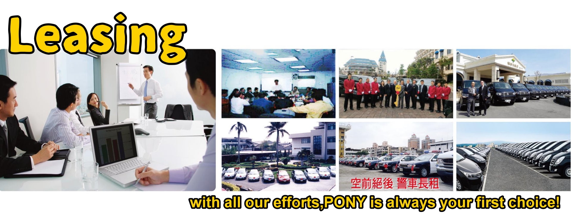 小馬租車1988年成立時之經營理念(長租/短租/旅運/全方面用車服務) 從您對汽車的使用上,不論是補償性(一~二天)、需求性(一~二月)、經濟性(一年以上), 專業的小馬租車可提供全國最大服務網,最多樣的車種、最優惠的價格與最完善的服務, 讓小馬為您節省寶貴的時間與金錢,並確保您行車的舒適與安全,小馬租車.依您所需.合乎您意。 |