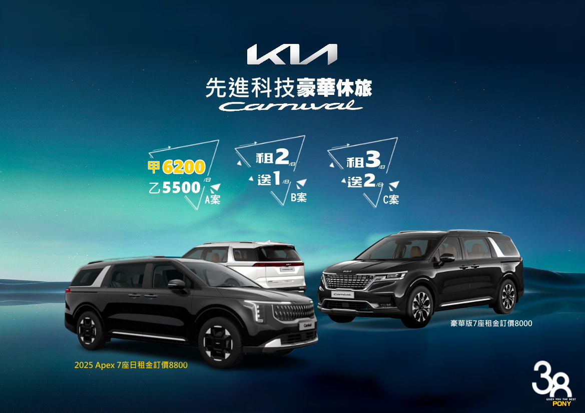 2.本專案KIA Carnival 七人座,甲:2025 APEX7座租金訂價8800/日,專案優惠【A案】平日優惠6200/假日+1000【B案】租2日送1日(接續租3日)17600【C案】租3日送2日(接續租5日)26400,乙:豪華7座租金訂價8000/日,專案優惠【A案】平日優惠5500/假日+1000【B案】租2日送1日(接續租3日)16000【C案】租3日送2日(接續租5日)24000,三天(含)以上連續假期與春節期間除外。
