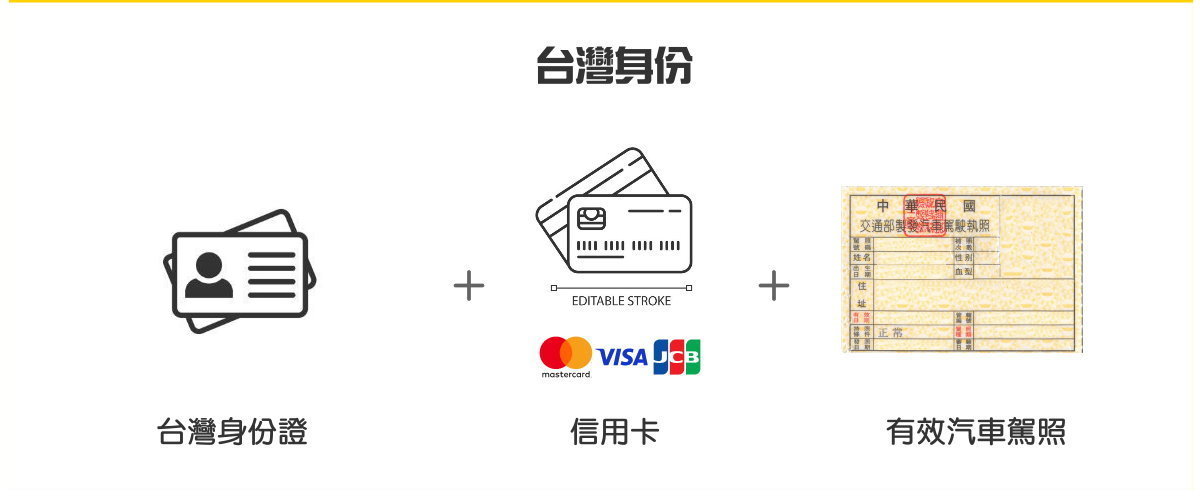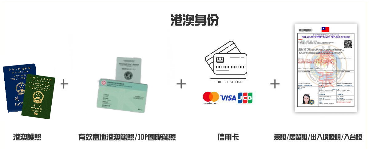 - 港澳人士(入境30天內還車):有效IDP國際駕照※、香港/澳門駕照、香港/澳門護照、信用卡(有效期六個月內)、入台證。