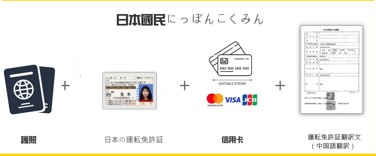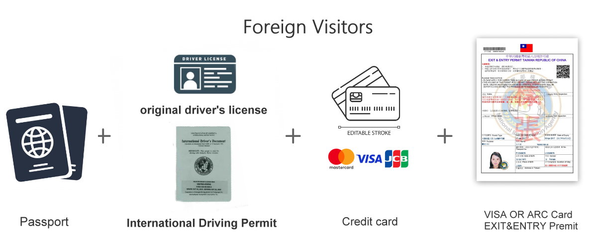 - 外籍人士(入境30天內還車):有效IDP國際駕照※、當地駕照、護照、信用卡(有效期六個月內)、簽證或居留證或出入境證明。